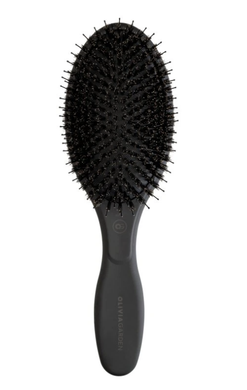Profesionálna oválna kefa OG Combo Black Label kombinuje prírodné diviačie štetiny a flexibilné nylonové štetiny, čím zaisťuje dokonalé rozčesanie, uhladenie a prirodzený lesk. Diviačie štetiny rozotierajú prirodzený maz po celej dĺžke vlasu, zatiaľ čo nylonové prenikajú hlbšie a rozčesávajú aj hustejšie pramene.