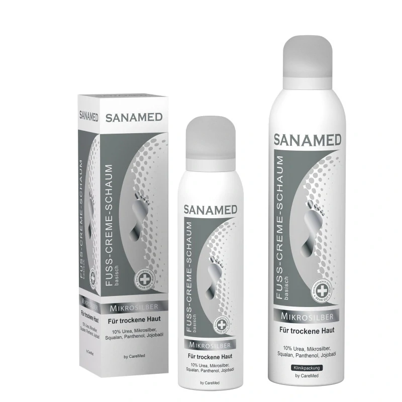 Sanamed Mikrosilber pena na suchú pokožku je špeciálna ošetrujúca pena s obsahom mikrostriebra, určená na každodennú starostlivosť o suchú, citlivú a problematickú pokožku nôh. Rýchlo sa vstrebáva a nezaťažuje pokožku.